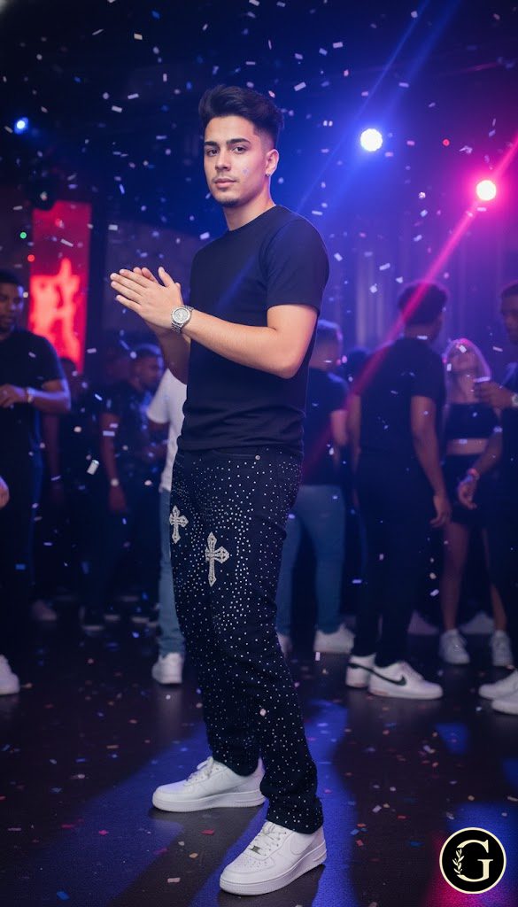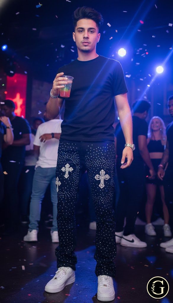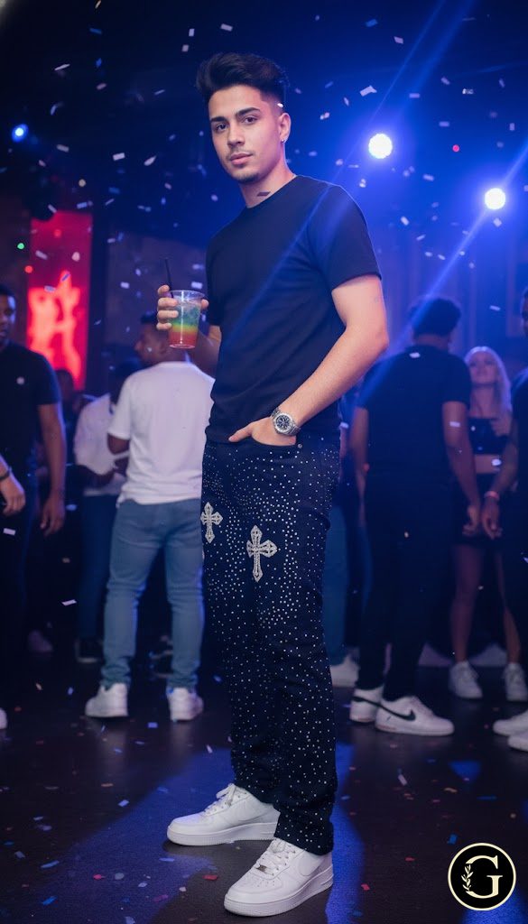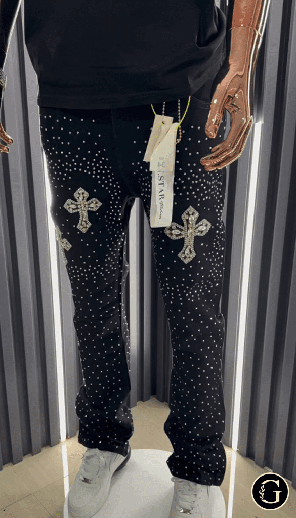 Llegó el jeans brillante con cruz, el modelo más llamativo de la temporada. Disponible en negro y azul, con un brillo único que eleva tu outfit al siguiente nivel.